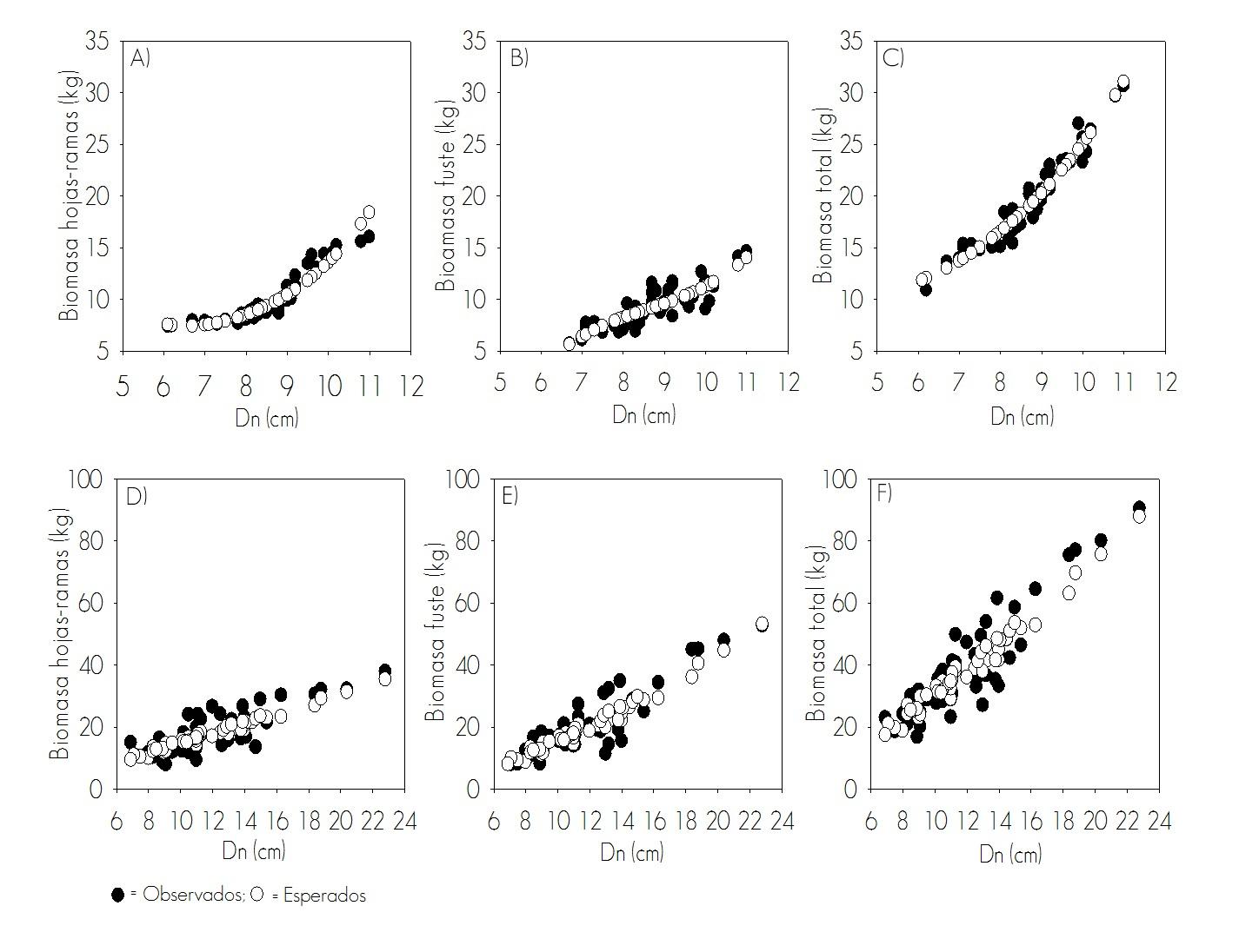 Biomasa hojas-ramas = Biomass of leaves and branches; Biomasa fuste = Stem biomass; Biomasa total = Total biomass; Dn = DN; Observados = Observed; Esperados = Estimated