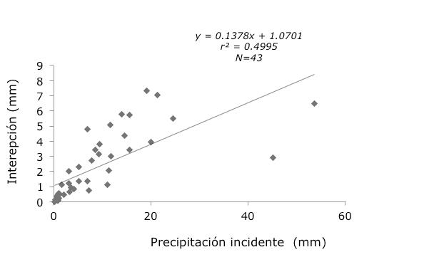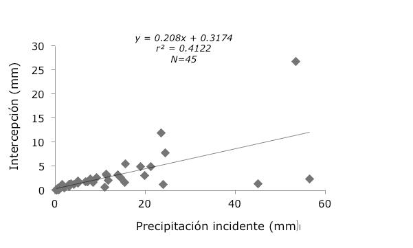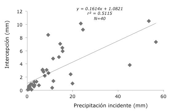 The results of the regression analysis between the incident precipitation and the intercept for A. farnesiana, Condalia hookeri, Casimiroa greggii and L. leucocephala showed that the values of the coefficient of determination (r2) were 0.41, 0.60, 0.51 and 0.49, respectively (Table 3); this indicates that other factors influence the interception losses such as the duration and intensity of rain, wind speed and direction and the structure of vegetation. The values of Cantú and González (2005) for A. berlandieri were of 0.735, for A. rigidula of 0.614 and for D. texana of 0.718; Yáñez (2014) calculated 0.723 for H. parvifolia; 0.821 for Ebenopsis ebano; 0.395 for Eucalyptus camaldulensis and 0.571for P. laevigata.