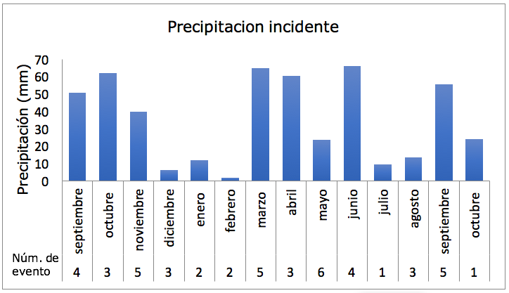 Precipitación = Rainfall; Precipitación incidente = Gross precipitation; Núm. De evento = Event number; septiembre = September; octubre =October; noviembre = November; diciembre = December; enero = January; febrero = February; marzo = March; abril = April; mayo = May; junio = June; julio = July; Agosto = August.