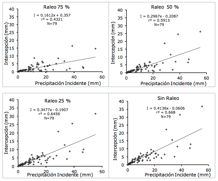 Los resultados de los análisis de regresión de la intercepción (Cuadro 1), fluctuaron entre r²= 0.42 para el raleo de 75 % hasta valores de r²= 0.66, en sitios en donde no se aplicó, los cuales presentaron un mayor porcentaje de pérdidas por intercepción. Esto sugiere que otros factores, tales como niebla, rocío, intensidad de lluvia, continuidad del evento de lluvia, velocidad del viento, entre otros, deben de ser tomados en cuenta para poder predecir con mayor exactitud la intercepción.