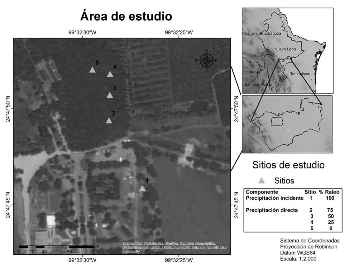 El objetivo del presente estudio fue determinar las cantidades de lluvia interceptada a diferentes intensidades de raleo dentro del Matorral Espinoso Tamaulipeco, por medio de mediciones de la precipitación incidente y precipitación directa, con base en la hipótesis que plantea que las diferentes intensidades de raleo difieren la cantidad de intercepción de lluvia y modifican la cantidad de agua que ingresa a este tipo de ecosistema regido por precipitaciones irregulares.