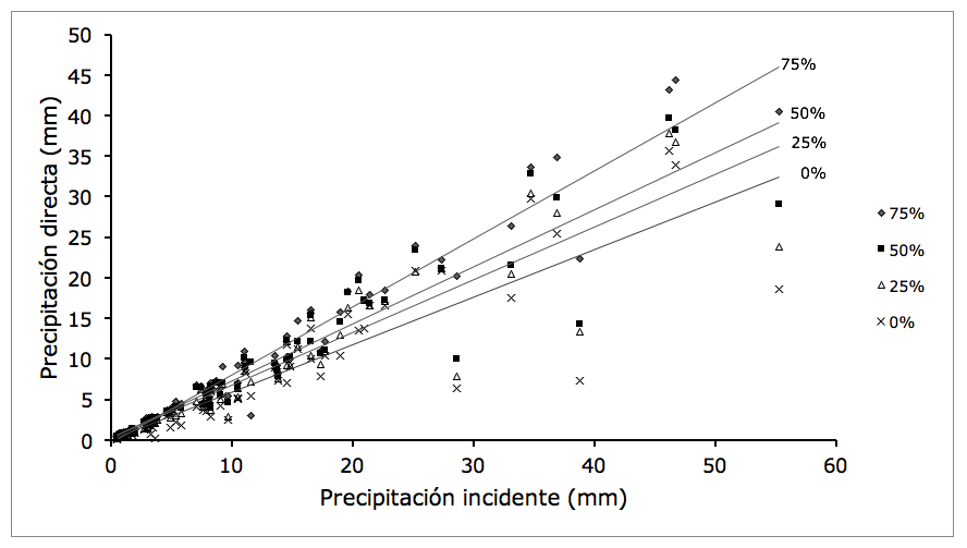 La relación entre precipitación incidente y precipitación directa registró un coeficiente de determinación promedio de r2>0.80, similar a los resultados de Besteiro y Rodríguez (2012), de r2>0.80 para una plantación forestal de pino y eucalipto, y de Cantú y González (2005) de 0.78 a 0.85 para A. berlandieri Benth., A. riguidula Benth. y Diospyros texana del MET.