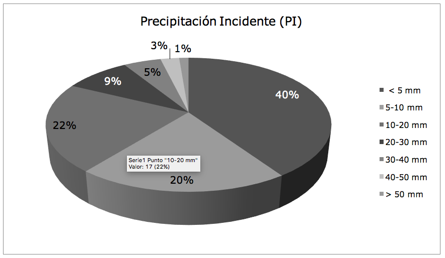 Figura 2. Porcentaje de eventos de lluvia de acuerdo con la cantidad registrada durante el periodo experimental.