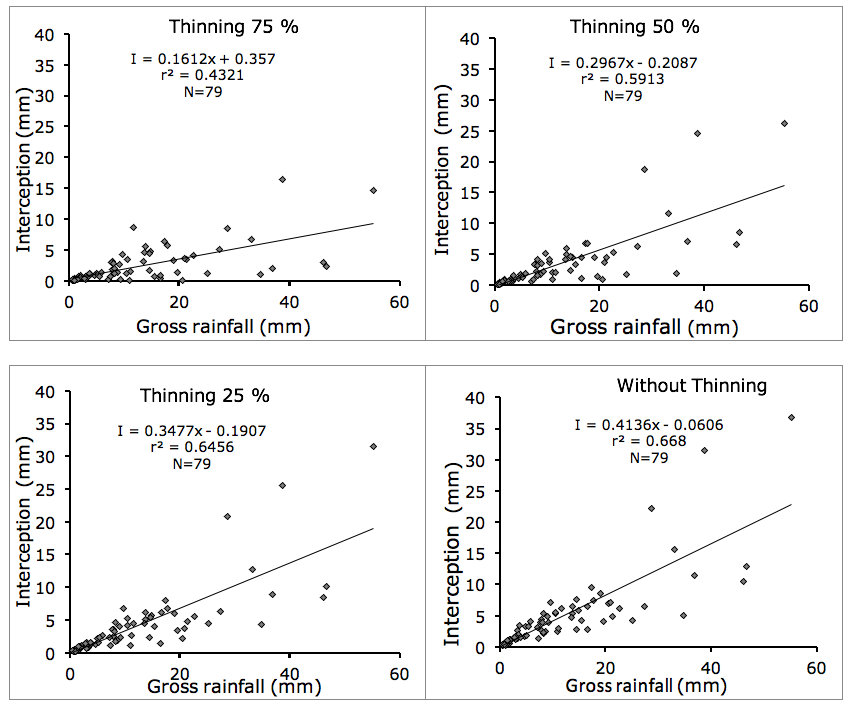 The results of the regression analysis of the intercept (Table 1), ranged from r² = 0.42 for thinning 75 % to values of r² = 0.66 in which there is no thinning, which had a higher percentage of interception losses. This suggests that other factors, such as fog, dew, rain intensity, continuity of the rain event, wind speed, among others, should be taken into account in order to predict the interception more accurately.