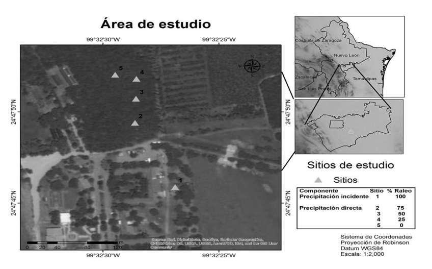 The scrub is the most abundant and historically used resource in the arid and semiarid zones of Mexico. The Tamaulipan thorn scrub (MET) extends over 200 000 km2 of northeastern Mexico and south Texas. It is a shrubby community formed by the dominance of thorny, deciduous species a large part of the year. Interception in arid and semi-arid ecosystems is important mainly from the irregularity and scarcity of rain, which affects the space-time variability of soil moisture (Yáñez et al., 2013).