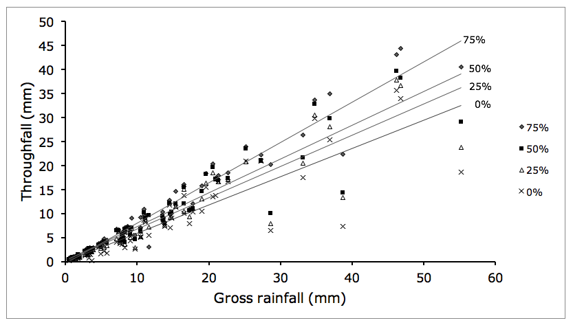 Table 1. Summary of the regression analysis to describe interception loss for the different thinning intensities.