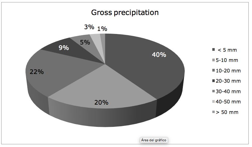 The gross precipitation derived from 79 events during the course of the experiment totaled 907.6 mm. Figure 2 shows the behavior of rainfall during the study period; the interval of individual rains was from 0.39 to 60.15 mm, with values less than 5 mm in 40 % of the total of the analyzed events; between 10 and 20 mm in 22 %, between 5 and 10 mm in 20 %; between 20 and 30 mm in 9 %; between 30 and 40 mm in 5 %, between 40 and 50 mm in 3 %; and in less than 1 % of events > 50 mm.