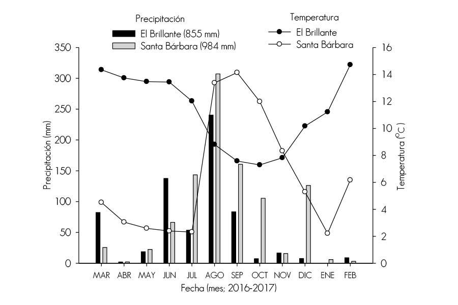 La temperatura media mensual y la precipitación mensual registrada durante el periodo de estudio se ilustran en la Figura 2.