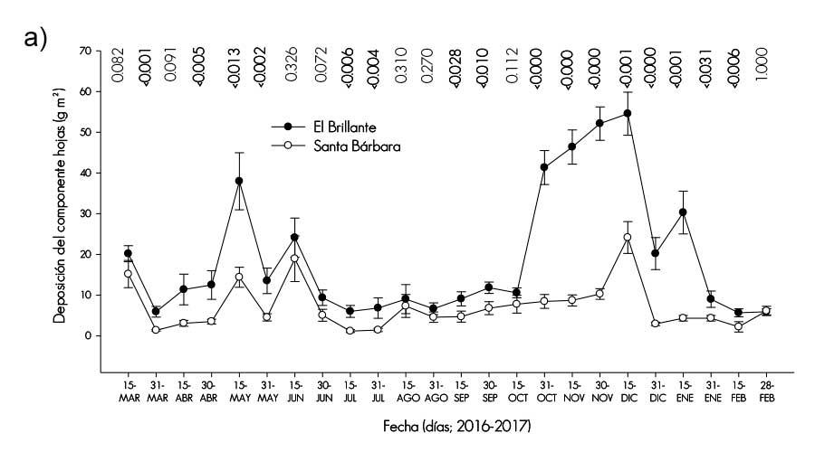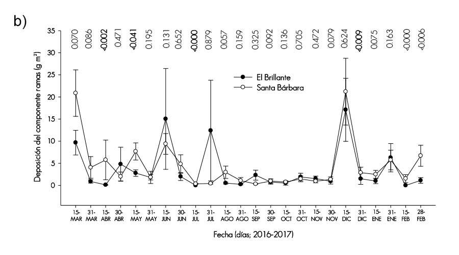 Hojas. Son el componente de mayor proporción en la acumulación total de hojarasca, que corresponde a 74.8 % (4.4) y 46.4 % (1.6 Mg ha-1 año-1) en El Brillante y Santa Bárbara, respectivamente. Al practicar el análisis estadístico de la producción total de hojas, se verificaron diferencias significativas entre los promedios de ambos sitios (P< 0.001). En Santa Bárbara los registros sitúan la producción por debajo de los señalados por Martínez (2014) para un bosque sin manejo, y los de Ibarra et al. (2011) en bosques naturales de Chile con Nothofagus pumilio (Poepp. & Endl.) Krasse, con una deposición de hojarasca de 6.5 Mg ha-1 año-1 para el primero y de 3.8 (bosque virgen) para el segundo.