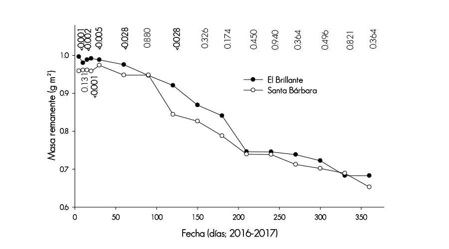 La comparación de la tasa promedio del componente foliar en los sitios de estudio a través de la prueba de Kruskal-Wallis se observa en la Figura 5; sugiere un patrón semejante de descomposición a partir del cuarto mes, para ambas localidades, por lo que se acepta la hipótesis en relación al proceso de descomposición. Cuando se contrastó la pérdida de masa orgánica al final del estudio (1 año), el porcentaje de descomposición para el primer sitio de interés fue de 31.7 %, en tanto que para el segundo fue de 34.7 %. Estos valores coinciden con los de Ibarra et al. (2011) durante un período de dos años en rodales de Nothofagus pumilio en la región de Magallanes, donde documentaron las variaciones de la masa relativa de la hojarasca. En un estudio de descomposición de la fracción foliar de Pinus patula Schiede ex Schltdl. & Cham., Martínez (2014) puso de manifiesto que en ninguno de los sitios estudiados el porcentaje de reducción de peso de la hojarasca fue diferente.