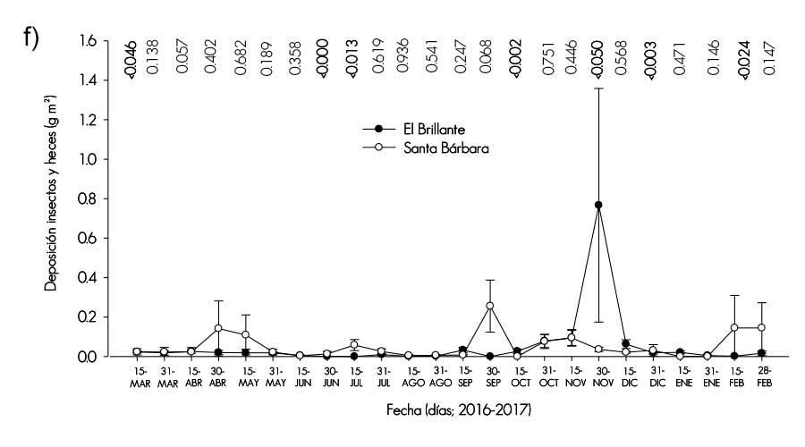 Insectos y heces. Durante el periodo de estudio este componente fue mayor en el sitio Santa Bárbara; el valor máximo representa 0.3 % (0.01 Mg ha-1 año-1) de la producción total y estadísticamente parece no existir diferencias en el aporte total (P< 0.103). Se acerca a los valores obtenidos por Ávila y Zamora (2010) que fluctuaron alrededor de 0.001 (selva media) a 0.01 Mg ha-1 año-1 (bosque caducifolio).