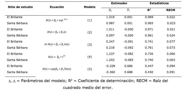 Los parámetros son similares a los registrados por Del Valle (2003), Ibarra et al. (2011) y Castellanos y de León (2011), quienes probaron modelos exponenciales con buenos estadísticos de ajuste.