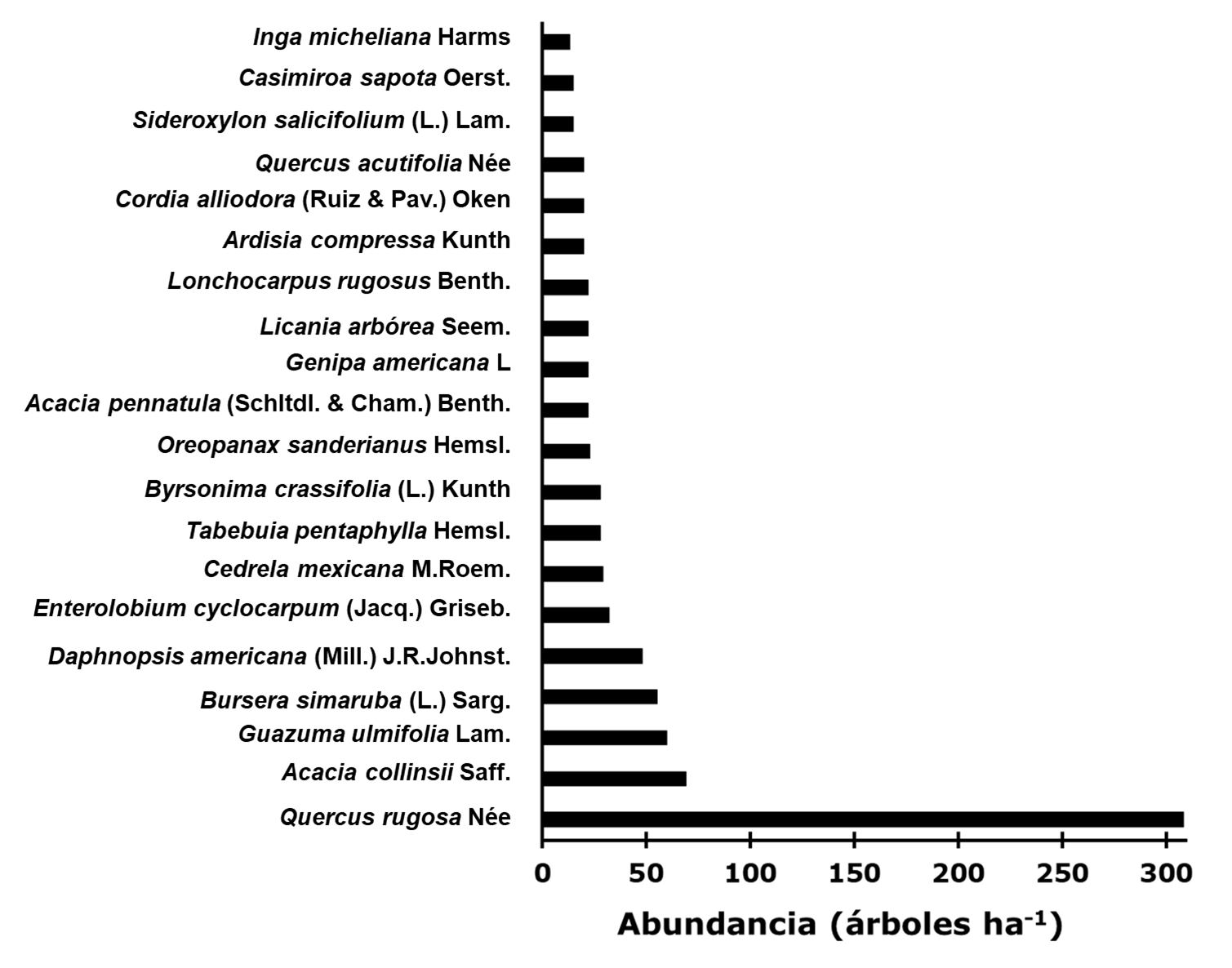 En las parcelas forestales se encontraron 46 diferentes especies de árboles, las 20 con mayor abundancia por hectárea se muestran en la Figura 2. Quercus rugosa, Acacia collinsii, Guazuma ulmifolia, Bursera simaruba y Daphnopsis americana (Mill.) J. R. Johnst. fueron las más abundantes en el área de estudio.
