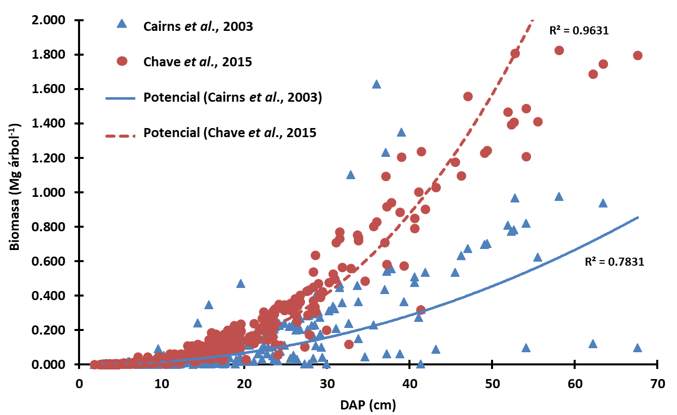 La biomasa área de los árboles se cuantificó mediante la ecuación propuesta por Cairns et al. (2003) con la corrección de densidad de madera de cada especie. A fin de evaluar el ajuste con los datos y hacer la comparación en la cantidad de biomasa entre dos ecuaciones, se utilizó la ecuación de Chave et al. (2015).