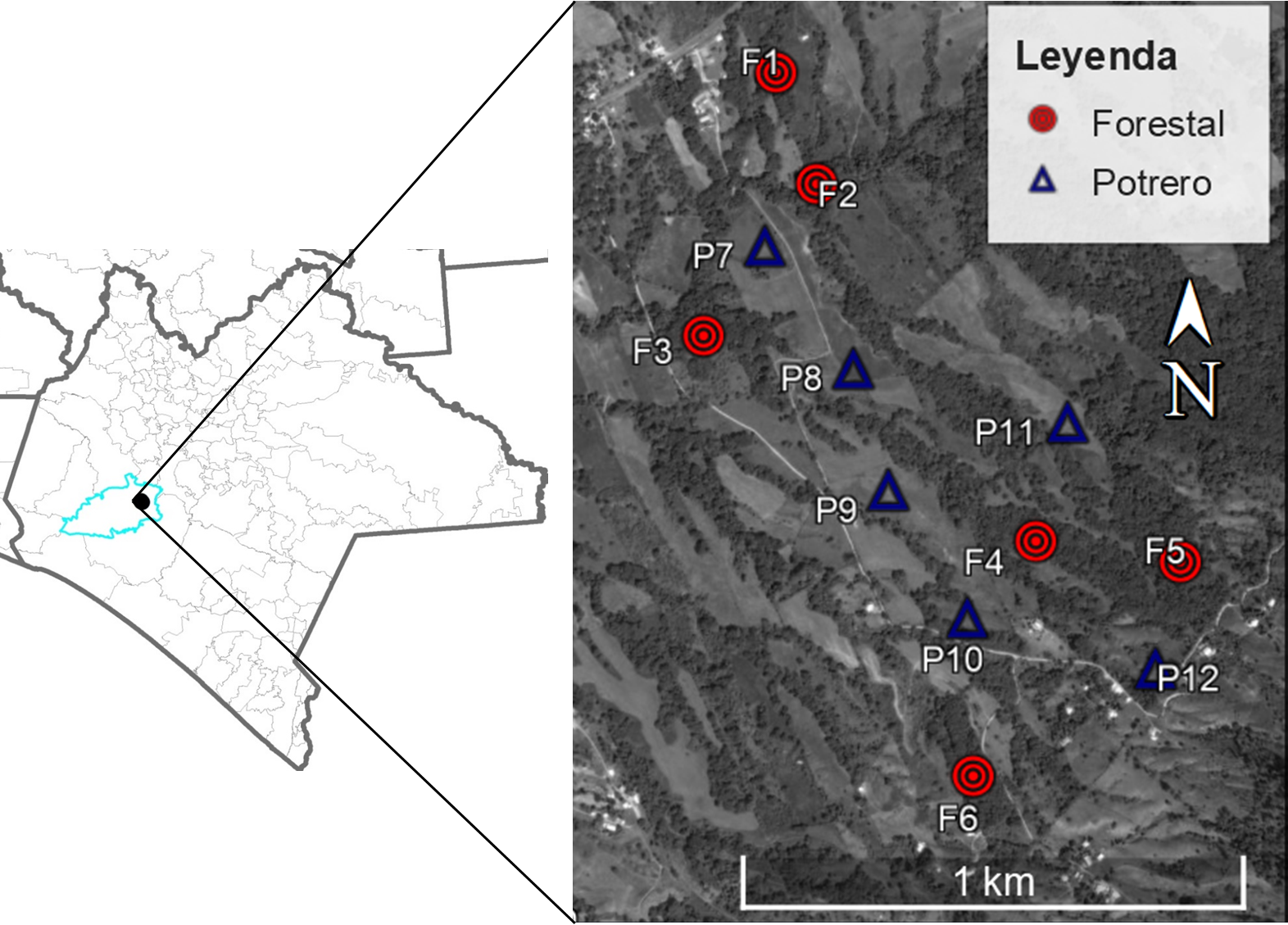 The samples were collected in the forest and grazing areas of the Los Flamboyanes cattle ranch. Field trips were made in the forest areas of the ranch through which twelve plots were defined in total, six of forest that did not have road crossings or human disturbance, and six other plots of pastures with or without trees. Subsequently, another systematic data capture was made, adapted to the methodology of the Inventario Nacional Forestal y de Suelo (National Forest and Soil Inventory) (INFyS) (Conafor, 2005).
