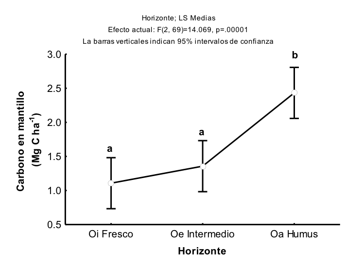 Carbono en mantillo = Carbon in mulch; Horizonte = Horizon; Oi Fresco = Oi Fresh; Oe Intermedio = Oe Intermediate
