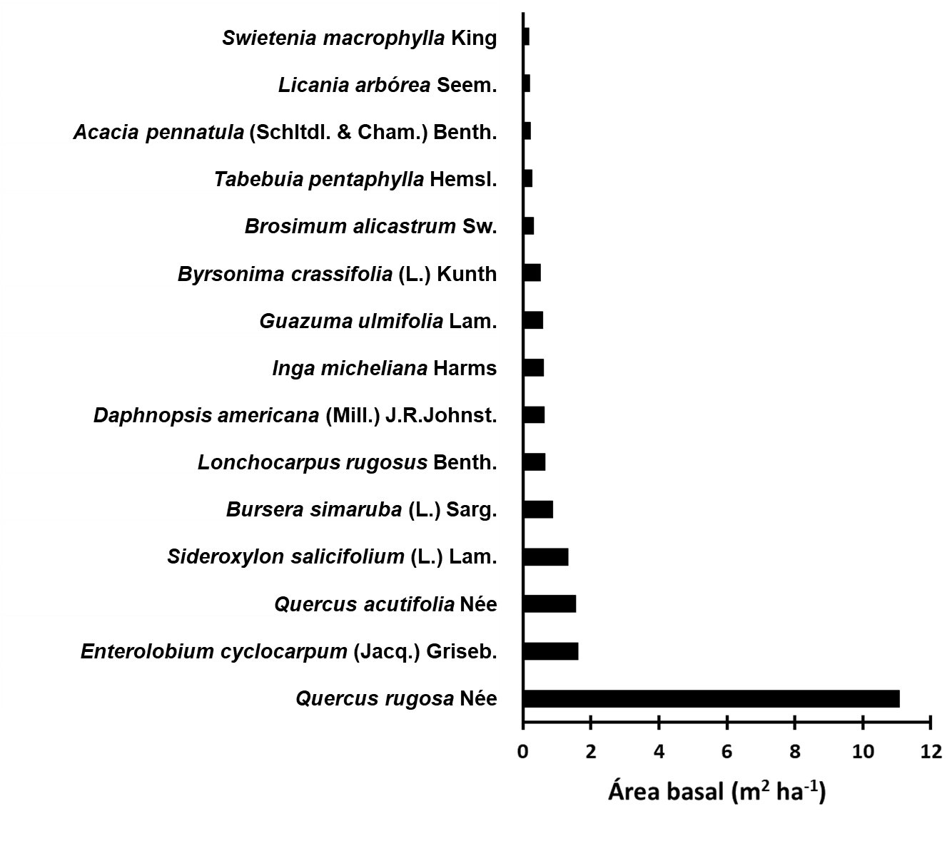 It can be seen in Figure 3 that the species with the highest dominance was Quercus rugosa, with a total AB of 11.07 m2 ha-1, followed by Enterolobium cyclocarpum (Jacq.) Griseb. with 1.62 m2 ha-1. The species of least dominance were Diphysa robinoides Benth. & Oerst., Albizia nipoides (Benth.) Burkart and Coccoloba cozumelensis Hemsl., with a basimetric area equal to or less than 0.01 m2 per hectare.