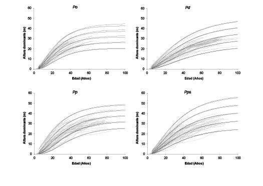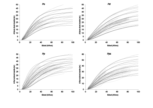 Los resultados indican que las diferencias entre los estadísticos de bondad de ajuste fueron mínimas entre los modelos evaluados, por lo que la selección del más apropiado se apoyó en el análisis gráfico de sobreponer las familias de curvas de crecimiento de altura dominante a las trayectorias de crecimiento de los datos observados; se consideraron categorías de IS de 15 m a 35 m para Pinus oaxacana, de 10 m a 30 m para Pinus douglasiana, con intervalos de 5 m; y de 14 m a 38 m, para Pinus patula y Pinus pseudostrobus, con intervalos de 6 m a una edad de referencia de 40 años para todos los casos (Figura 2). Lo anterior, con base en que diferentes modelos pueden presentar los mismos estadísticos de bondad de ajuste o de comparación, pero una respuesta distinta a las trayectorias de los datos observados; así, unos subestiman en las primeras edades y sobreestiman en las avanzadas, o viceversa (Diéguez-Aranda et al., 2006).