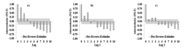 Figura 4. Gráficas de la Función de Autocorrelación Parcial de la ecuación de Bertalanffy-Richards (Ecuación 6): a) ajuste sin corrección de la autocorrelación, b) al considerar un modelo CAR1, y c) con un modelo CAR2.