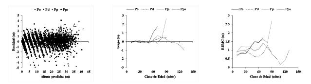 Los errores promedio de la REMC del modelo 6, con la estructura del error oscilaron de 0.79 m (Pd) a 1.18 m (Pp) (Cuadro 4), y explicaron más de 98 % de la varianza del crecimiento en altura dominante. El modelo autorregresivo continuo de segundo orden (CAR2) garantizó la independencia de los residuales en el proceso de ajuste.