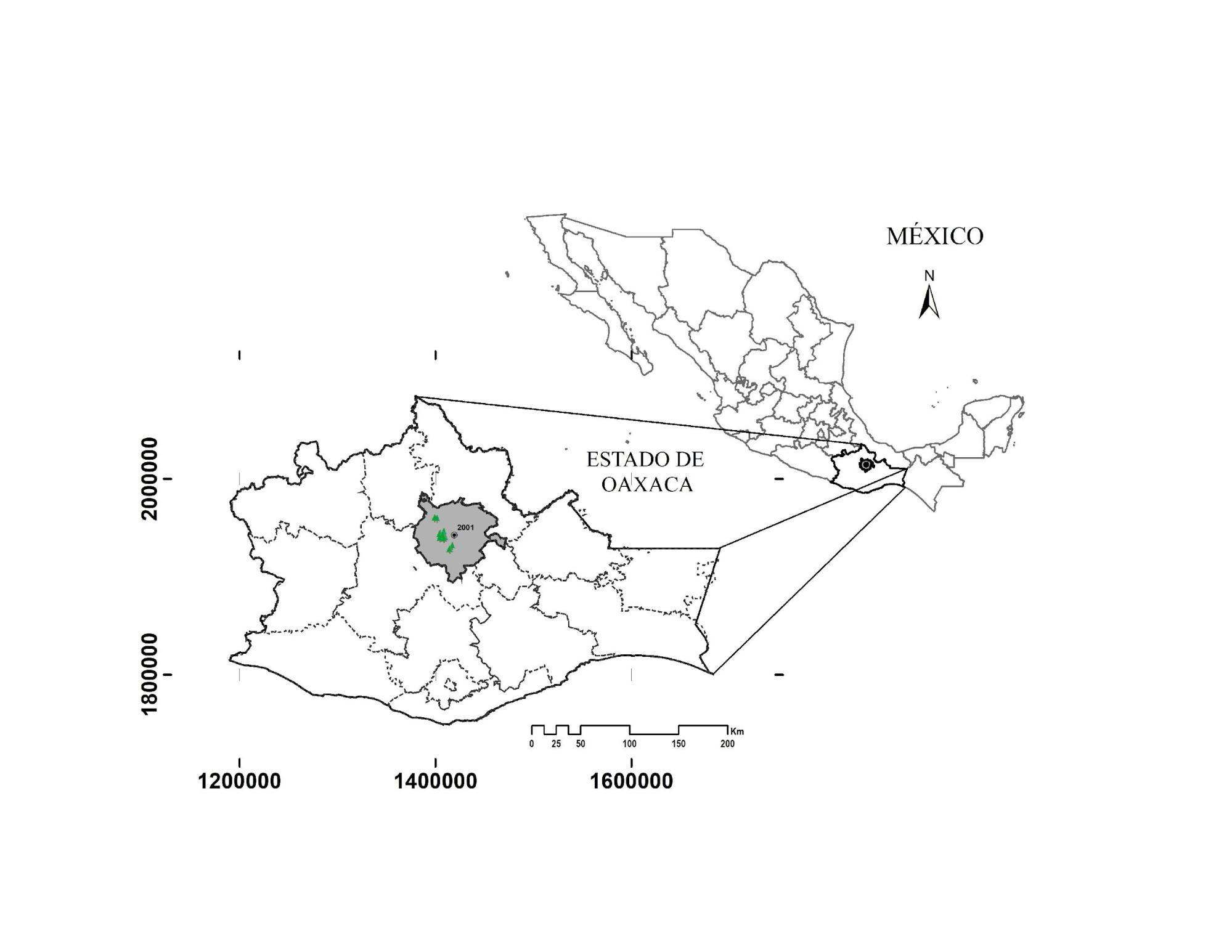 El estudio se llevó a cabo en los rodales bajo aprovechamiento forestal localizados en la Umafor 2001, ubicada al noreste del estado de Oaxaca, México, y que abarca una superficie de 195 397 ha. Se localiza a los 17°22’58” N y los 96°22’29” O (Figura 1). La altitud de las áreas de muestreo varía de 1 800 a 3 361 m. La temperatura anual oscila entre -3 °C y 28 °C, con precipitación promedio anual de 3 797 mm (Granados-Sánchez, 2009). El tipo de vegetación predominante corresponde a bosques de pino-encino, con dominancia de Pinus oaxacana, P. douglasiana, P. patula, P. pseudostrobus, P. leiophylla Schiede ex Schltdl. & Cham., P. pringlei Shaw., P. rudis Endl., P. teocote Schiede ex Schltdl. & Cham., Quercus crassifolia Bonpl., Q. laurina Bonpl. y Q. rugosa Née, principalmente.