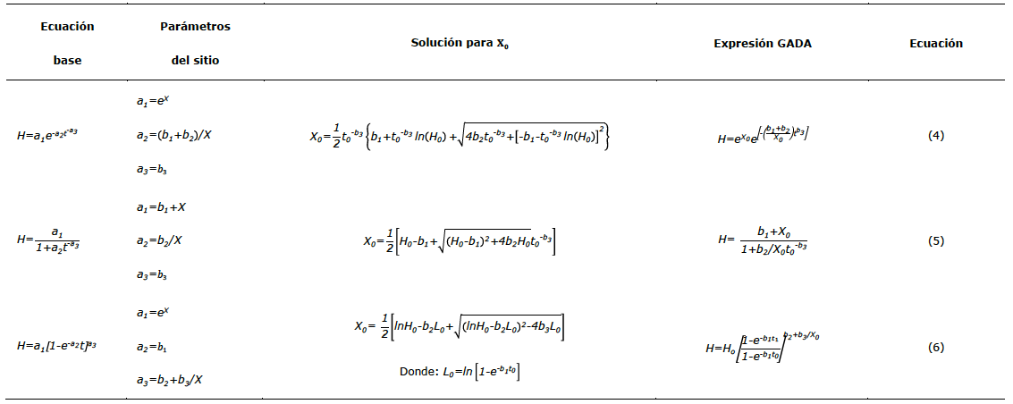 El desarrollo de cualquier ecuación dinámica con la formulación GADA considera: i) seleccionar una ecuación base e identificar el número de parámetros que serán dependientes de la productividad del sitio; ii) los parámetros seleccionados se expresan como funciones de la calidad de estación definida por la variable X0 (variable no observable e independiente que describe la productividad del sitio, como resultado de la suma de factores ecológicos, climáticos, regímenes de manejo, condiciones del suelo y los parámetros nuevos; iii) la ecuación base bidimensional (H=f(t)) seleccionada es expandida a una ecuación tridimensional (H=f(t, X0)) de índice de sitio; y iv) se despeja el valor de X0, a partir de condiciones iniciales del sitio; es decir, de valores de partida de altura dominante – edad (t0, H0), de forma que el modelo pueda definirse implícitamente y aplicarse en la práctica (H=f(t, t0, H0)) (Cieszewski y Bailey, 2000; Cieszewski, 2001; Cieszewski, 2002; Cieszewski, 2003). Durante el proceso, a menudo se eliminan parámetros redundantes y se obtiene un modelo con un número de parámetros menor o igual que la ecuación base original.