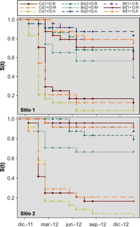 Figure 1. Estimated survival function [S(t)] for the different treatments evaluated for reforestation with Pinus pseudostrobus Lindl.,in two plantation sites.