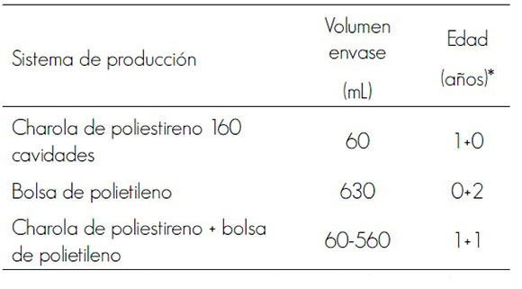 Se seleccionaron ejemplares de Pinus pseudostrobus cultivados en tres sistemas de producción (Cuadro 1) en el Vivero Forestal Bosque Escuela de la Facultad de Ciencias Forestales (UANL), ubicado en el ejido Santa Rosa, municipio Iturbide, Nuevo León, en las coordenadas 24°42.37’ N y 99°51.69’ O y a una altitud de 1 609 m. En todos los sistemas, las plantas estuvieron bajo condiciones de sombra durante el primer año y a la intemperie en el segundo año, para el caso del sistema en bolsa de polietileno. Como sustrato se utilizó una mezcla de turba de musgo (57 %) y tierra de monte (43 %), a la que se le agregaron 5 kg m-3 de fertilizante de liberación controlada (Osmocote®). Durante el periodo de producción se aplicaron riegos cada tres días, de acuerdo a las rutinas convencionales del vivero.