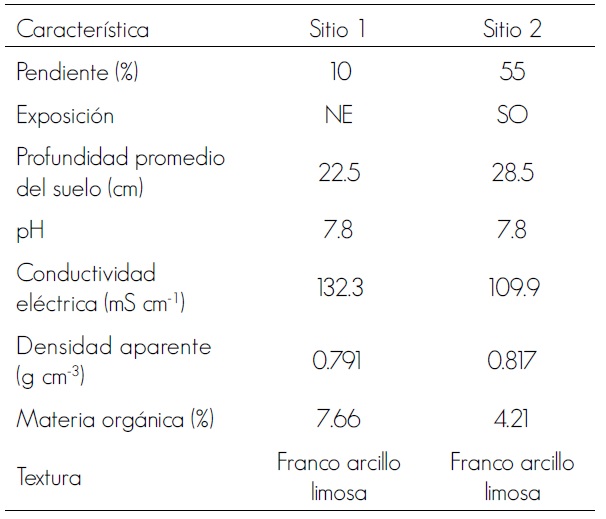 La supervivencia de una planta en un determinado sitio puede ser afectada por las propiedades físico-químicas del suelo como: humedad, temperatura, pH, conductividad eléctrica y contenido de nutrientes (Omary, 2011); aunadas a las condiciones topográficas (Chen y Klinka, 1998) y al método utilizado para establecer la plantación (Ortega et al., 2006). En este ensayo, los sitios presentaron propiedades edáficas similares (Cuadro 2); por lo tanto, las diferencias entre sitios de plantación es probable que se deban a las distintas pendientes y exposiciones.