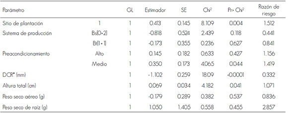 Otra variable que incidió significativamente en la supervivencia fue la altura del tallo, que contrario al efecto del diámetro presentó un estimador con signo positivo, aunque con una relación de riesgo baja (1.071), lo que indica que el aumento de 1 cm de altura incrementa el riesgo de muerte en 7.1 % durante los primeros meses después de establecer la plantación.