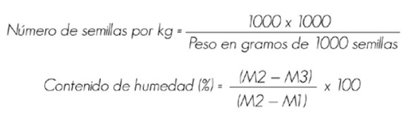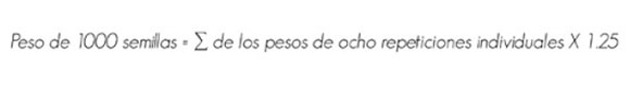 Peso de la semilla. Se tomaron ocho réplicas de 100 semillas; cada una se pesó con una balanza analítica (Presición en mg, marca ScientechTM modelo SA 210). Con estos valores se estimó el peso de 1 000 semillas mediante la siguiente fórmula (ISTA,1993):