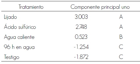 El componente principal uno, como nueva variable, resultado del análisis multivariado de componentes principales, incluyó 64.44 % de la variabilidad total de las variables originales. El análisis de varianza de dicho componente mostró diferencias estadísticas significativas (p˂0.0001) entre los tratamientos pregerminativos. La comparación de medias de Tukey del mismo sugiere que el lijado fue el mejor, aunque fue estadísticamente igual que el ácido sulfúrico, mientras que los demás tratamientos tuvieron valores inferiores (Cuadro 4).