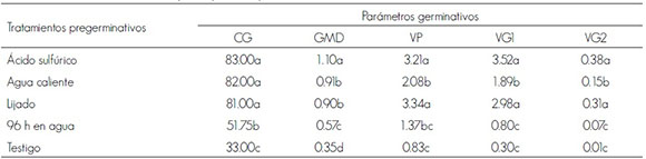 Existieron diferencias significativas entre los tratamientos pregerminativos probados para todos los parámetros evaluados (P<0.0001), lo que coincide con otros trabajos realizados anteriormente en E. cyclocarpum y otras latifoliadas (Somarriba y Ferreiro, 1984; Hernández et al., 2001).