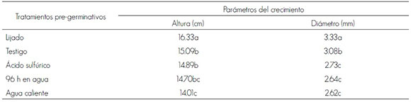 Existieron diferencias significativas entre los tratamientos pregerminativos para las variables del crecimiento (p<0.0001). De manera similar, Sánchez y Ramírez (2006) confirmaron lo anterior en el crecimiento en altura de plántulas de Leucaena leucocephala evaluadas al mes de edad.