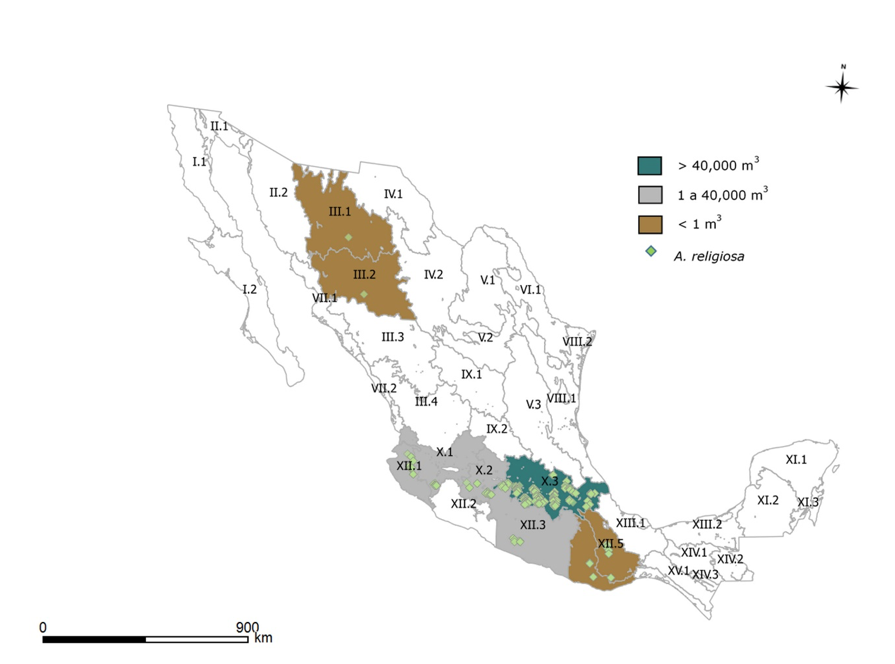 Ante este contexto, el presente trabajo tuvo como objetivo determinar la producción maderable de A. religiosa en las zonas de movimiento de germoplasma (ZMG) de México, las cuales son áreas ecológicas suficientemente homogéneas en donde se alberga la especie y tienen una administración operativa superior a las convencionales: local, estatal o las Umafor.