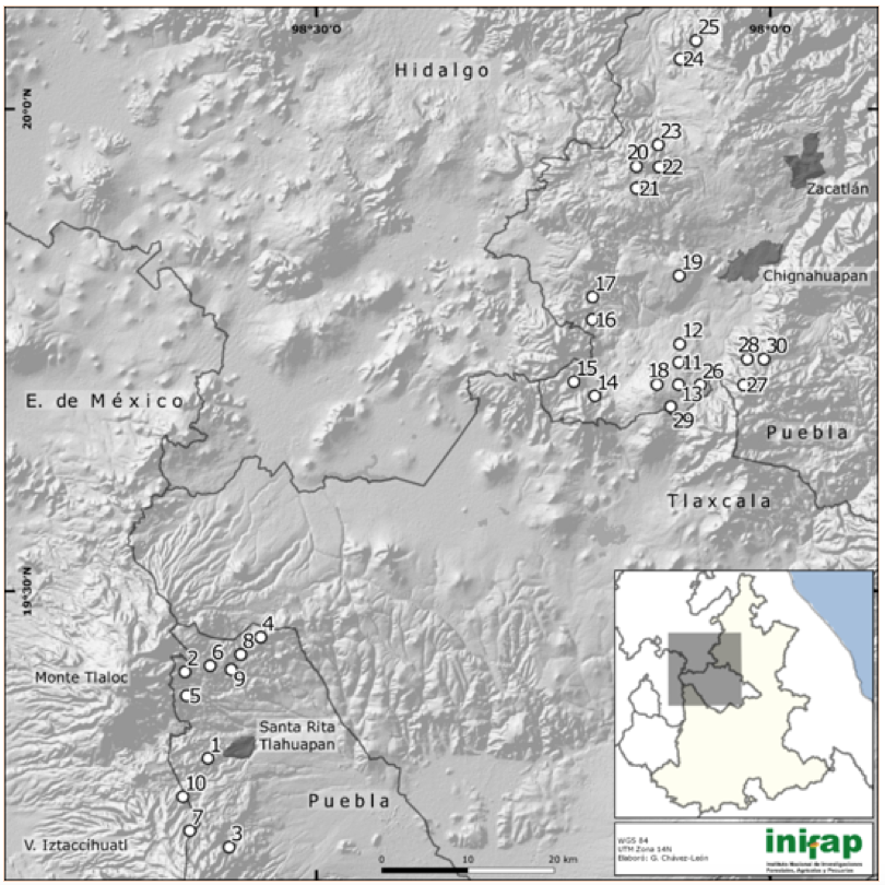 8 | Santiago Coltzingo | 19°26’03.3” | 98°35’00.3” | 2 801 | MMOBI | Corta de selección |