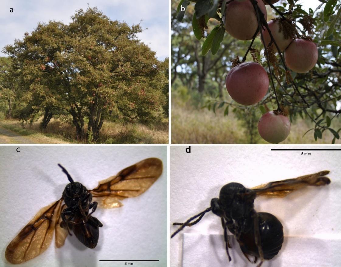 Figure 5. a) Quercus crassipes Humb. & Bonpl. tree with galls, b) Galls found and collected in May, and c and d) Amphibolips hidalgoensis Pujade-Villar & Melika 2011 adults associated to the galls.
