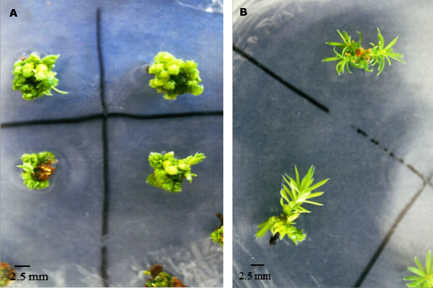 Según von Arnold y Grönroos (1986) las áreas meristemáticas son el resultado de la exposición supraóptima y prolongada a citocininas, por lo que la formación de meristemoides distintivos, se obtiene al reducir el tiempo de exposición a estos reguladores de crecimiento. En Pinus banksiana Lamb., se describe que las células en contacto con el medio proliferan, pero nunca dan origen a brotes (Pelletier y Laliberté, 2000), lo cual contrasta con las observaciones del presente trabajo.