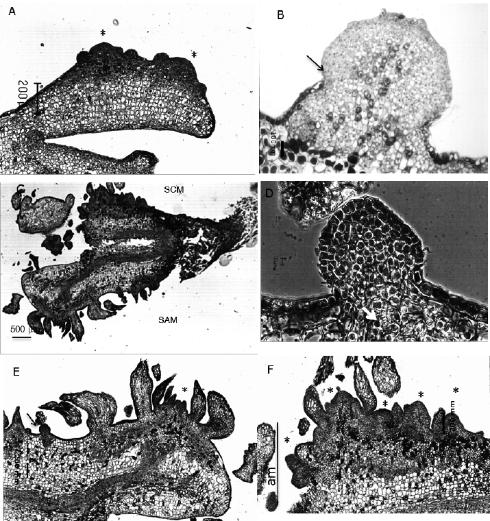 A. Primordios de brotes formados sobre cotiledones después de 30 días de cultivo (4X); B. Estructura nodular meristemática formado en la superficie del hipocotilo de la SCM después de 30 días; la flecha señala la ruptura de la epidermis (10X); C. Formación de brotes a lo largo del hipocotilo y cotiledones después de 40 días (5X); D. Nódulo meristemático mostrando la diferenciación de traqueida (flecha), Normanski 50X; E. Acercamiento de un brote formándose sobre un cotiledón en la superficie alejada del medio (SAM), así como nódulo meristemático (flecha) (10X); F. Acercamiento de brotes formándose a partir de un área meristemática (am) de la superficie en contacto con el medio (SCM) (20X).