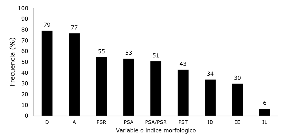 Species | PT | PP | Morphological variables and indexes | Ref. | |||||||