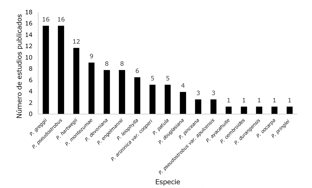 The hitherto published studies cover only 17 (29.8 %) of the 57 taxa that exist in Mexico. The most studied species, in descending order, are: P. pseudostrobus Lindl., P. greggii Engelm. ex Parl., P. hartwegii Lindl. and P. montezumae Lamb. (Figure 2). These four species account for 52 % of the reviewed studies, although Perry (1991) points out that several Mexican pine taxa have a great potential for use in commercial tree plantations.