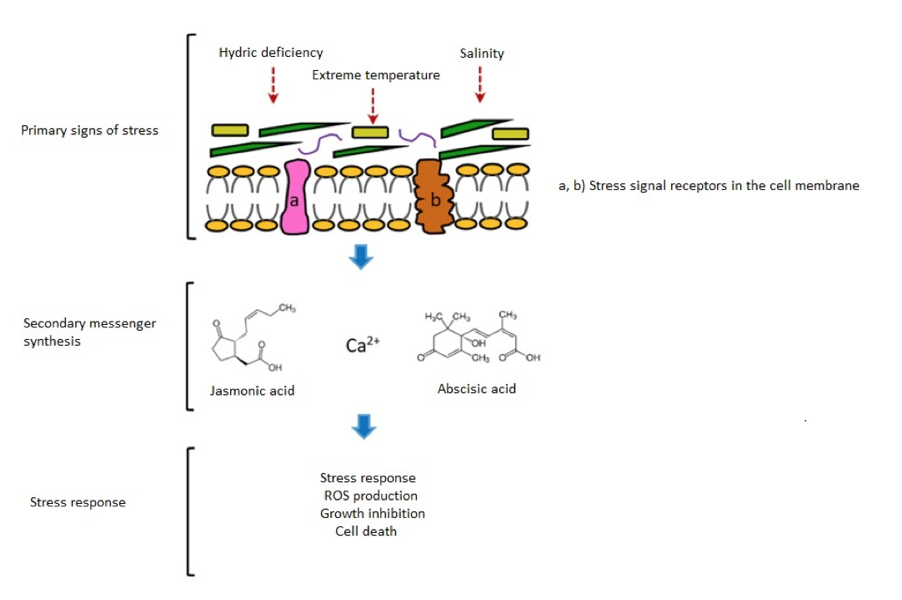 Signal transduction (also known as cell signaling or transmembrane signaling) is part of the process whereby the cells communicate with their environment and which allows them to respond to external stimuli through changes in the gene expression (Bradshaw and Dennis, 2010) that will eventually culminate in adaptation or in death (Tuteja, 2007). Thus, the reception of primary signals causes the production of second messengers (Dixit and Jayabaskaran, 2013), which are mainly non-protein molecules such as calcium, cyclic nucleotides, polyphosphoinositides, nitric oxide, sugars, abscisic acid, jasmonic acid, salicylic acid and polyamines (Tuteja and Sopory, 2008). The plants face various types of stress simultaneously, which suggests that the signaling routs interact with one another so that they may be additive, negative or compete for a target (Knight and Knight, 2001).