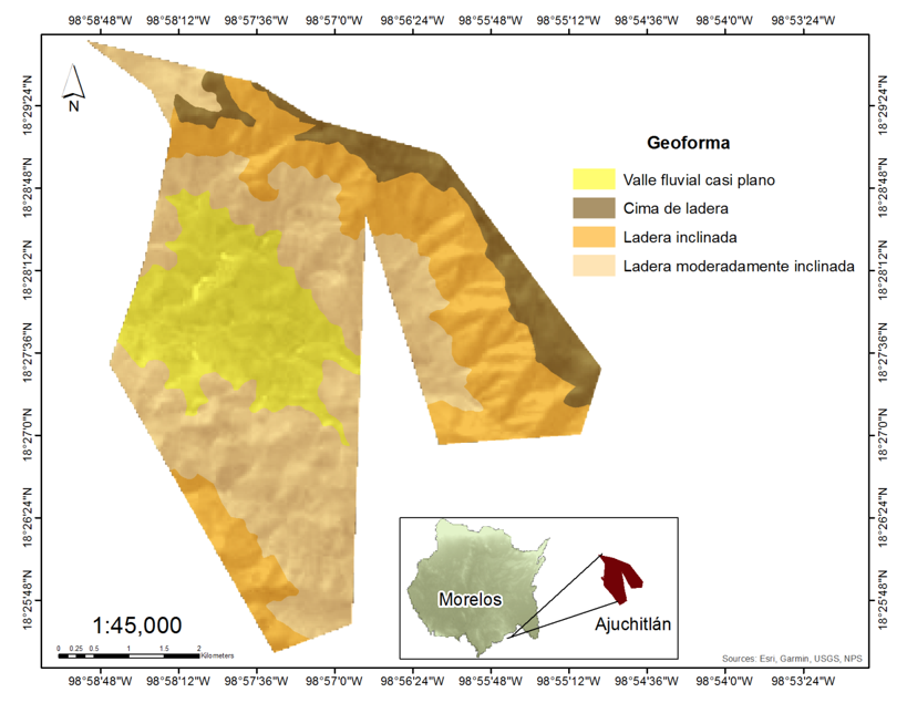 Figura 1. Distribución espacial de las geoformas delimitadas en Ajuchitlán, Tlaquiltenango, Morelos.