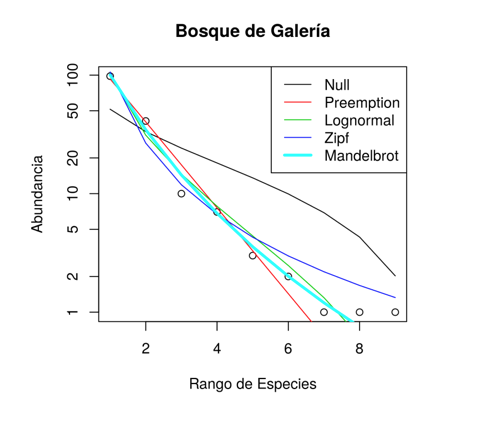 The Preemption model, also known as preferential niche or geometric series model, had a slightly smaller adjustment than the previous one; this implies that a few abundant species are present in a large proportion on one part of the hyperspace of the niche, and therefore, their occurrence varies with those situations in which the habitat is sequentially occupied (Aguirre et al., 2008). Alanís-Rodríguez et al. (2017) observed that the geometric model was the one that best adjusted to a mesquite forest in central Nuevo León, in northeastern Mexico. The authors suggested that this is a typical structure for a severely disturbed environment. However, the studied community is not subjected to a severe disturbance; therefore, the Mandelbrot model, with a better fit, is the one that best describes the community, since the species analyzed in the gallery forest respond to specific factors that determine the ecology of the community, including environmental factors like geomorphology, the water flow or organic matter flow, or biological factors of its own, such as a rapid growth and being shade-intolerant.