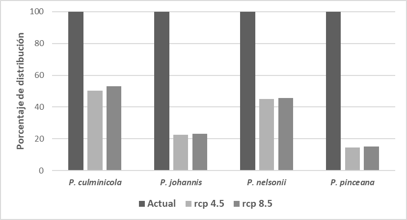 El P. pincena tiene mayor extensión de superficie idónea alta y, en menor proporción, le siguen P. johannis, P. nelsonii y P. culminicola.