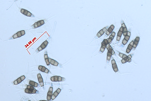 Izquierda: Mancha clorótica; Derecha: Estructura de los conidios septados y flagelados sin micelio.