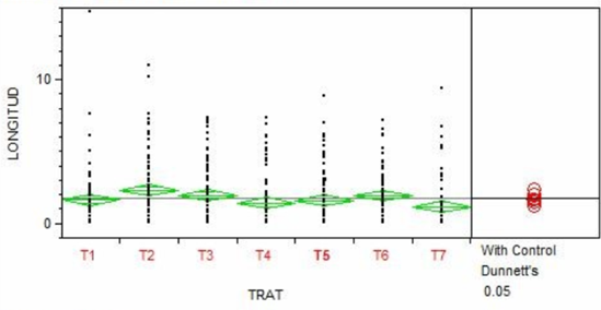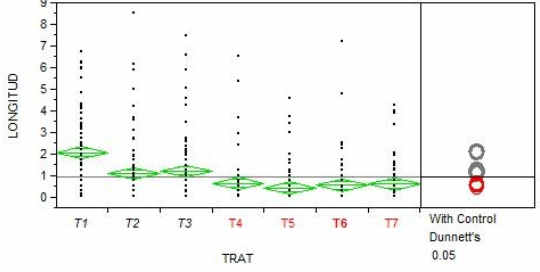 Posteriormente, se generó una base en Excel (2007) para calcular la estadística descriptiva y un promedio de cada tratamiento por la longitud del daño de las manchas cloróticas en las acículas. Finalmente, se efectuó un análisis de varianza para determinar diferencias significativas entre tratamientos (Statistic JMP 4) (SAS, 2000). Además, se realizó la prueba de Dunnett para la comparación de medias múltiples y para confrontar la efectividad entre tratamientos del primero y el último muestreo.