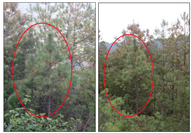En cada sitio se establecieron parcelas en las que se seleccionaron siete árboles con signos de daño foliar, con una distancia mínima entre ellos de 10 m. Las características que presentaron los individuos fueron altura de 4 a 7 m, diámetro de copa de 9 a 21 m y diámetro normal a la altura de pecho (1.30 m aproximadamente) de 200 a 600 cm; con signos de lesiones en las acículas (manchas cloróticas anilladas).