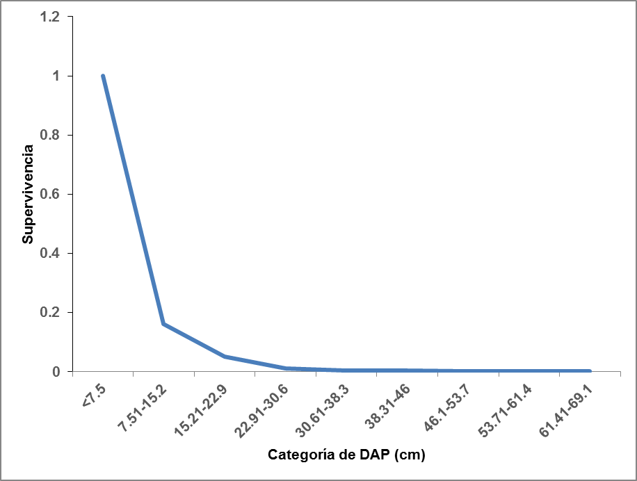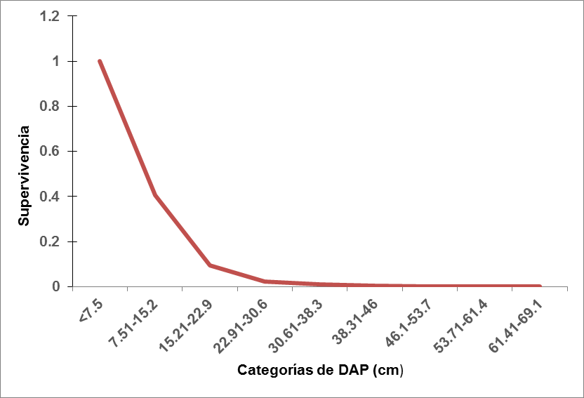 Cabe destacar que para un mejor manejo de la información se modificaron las categorías de tamaño usadas en las tablas de vida, ya que a partir del intervalo dimétrico 22.91-30.6 cm no se encontraron individuos.