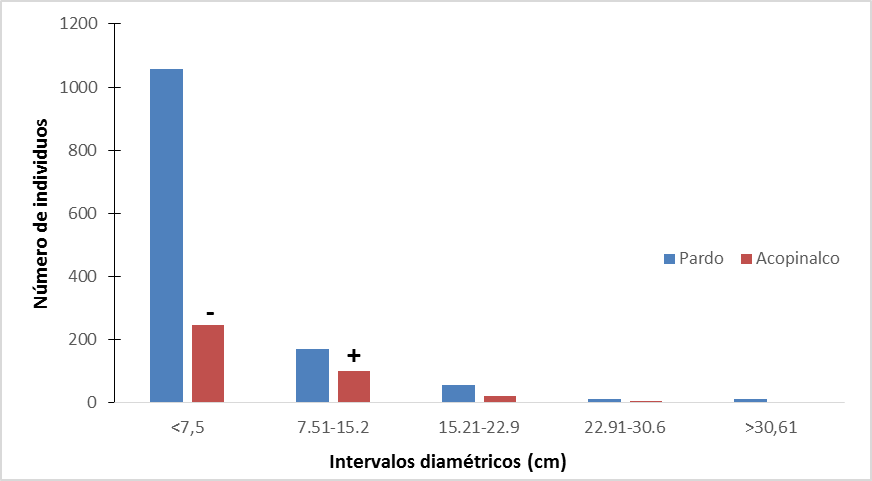 En el estudio realizado en EP y RAP, la estructura de tamaño difiere entre los sitios de muestreo, lo cual coincide con lo documentado en la literatura (Otto et al., 2005; Ayerde y López, 2006; Pérez et al., 2007). En RAP hubo menos individuos con DAP < a 7.5 cm de los que se esperaban, y más en la categoría 2 (7.51-15.2 cm). Sin embargo, los datos son similares a los de Otto et al. (2005), autores que consignan una mayor densidad de los individuos con menor DAP y altura.
